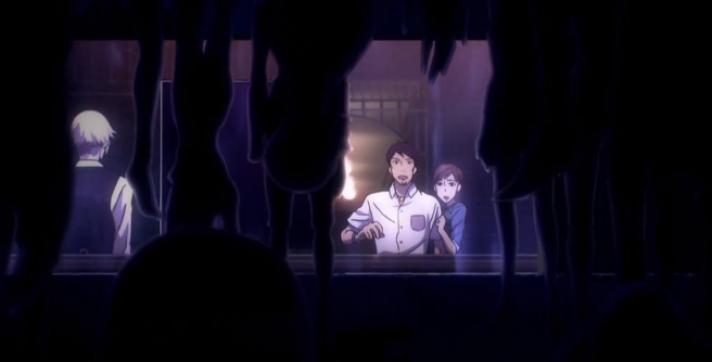 يبداو بالتقدم بهدوء حتى يصلو الى الباب ... يفتح كريس الباب فينظر اليه جميع الوحوش