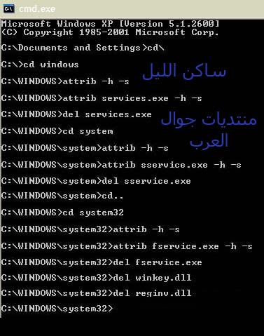 4- attrib services.exe –h –s وهذا الأمر لسحب خاصية الإخفاء والنظام من هذا الملف ليكون بإمكانك حذفه.