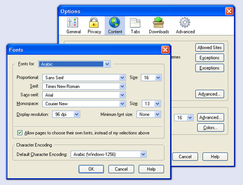 من Tools ثم Options ثم Content ثم Adveanced قم تقوم بضبط الترميز Charecter Encoding كما بالصورة