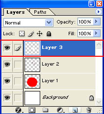 ثم ارجع إلى أول طبقة في الدرس ( الدائرة الحمراء) قم بتحديدها وذلك بالضغط المستمر على Control ثم النقر مرة واحدة على نفس الطبقة