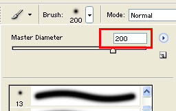 الآن اختر الفرشاة ( يجب أن تكون أطراف الفرشاة انتشارية وليست حادة ) واجعل مقاسها 200 بيكسل كما في الشكل
