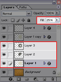 الآن اجعل الـ Fill لكل طبقة من الطبقات الثلاث الأولى = 25 كما في المثال: