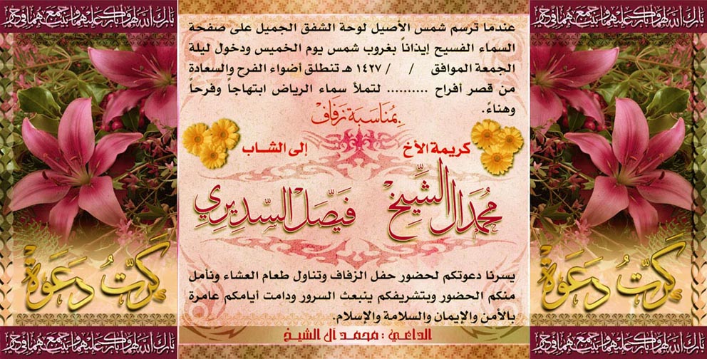 هناك بعض الأفراح تقام بشكل مغايير عن الأفراح التي نعرفها .. يعني بدل من إحضار فرقة موسيقية ورقص ووو .. هناك الكثير الان يتجه ولله الحمد بدعوة المشايخ والدعاة وهم في المقابل يتولون مسؤولية إحياء هذا الفرح عن طريق المحاضرات الدينية التي تحث على الزواج وتبين الفائدة منه ووو... وتقيم المسابقات الدينية بين الحضور وغيرها من البرامج الدينية ... فأعتقد البطاقات بهذا الشكل تكون مناسبة جداً ^^